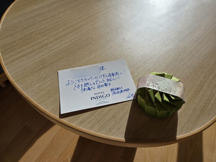テーブルの上にはウェルカムメッセージと飴が置いてありました。