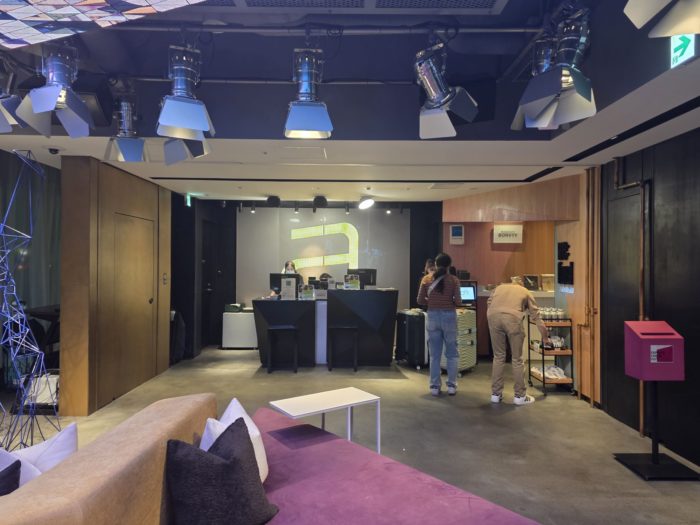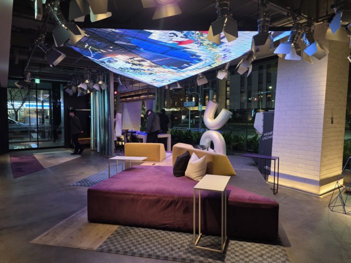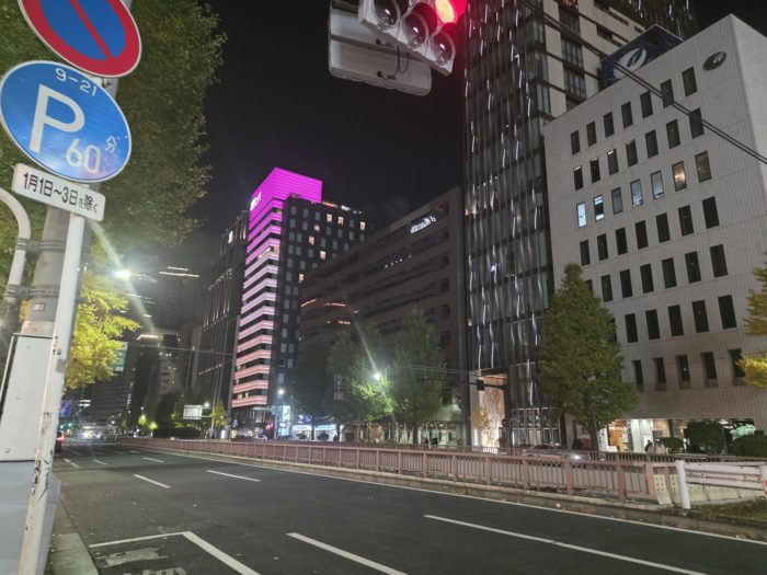 銀座にはアロフト、コートヤード、ACと3つのマリオット系ホテルが並んでいますが、外から見るとアロフトだけ派手。真ん中のピンクのビルです。