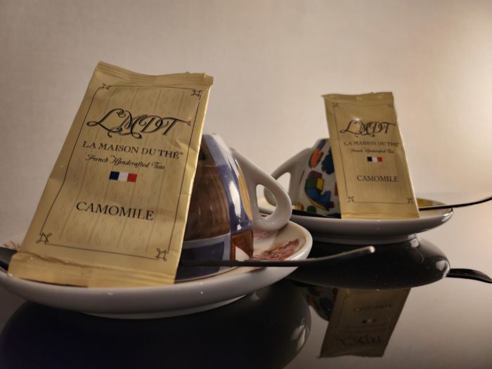 ベッドサイドにミネラルウォーターとグラスが置かれ、テーブルにはカモミールティーを用意してくれました。