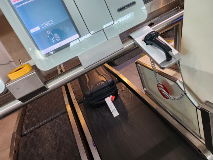 その機械に備え付けのスキャナーで先ほどプリントした搭乗券を読み取らせると、荷物をベルトの上に置くよう画面に指示が。