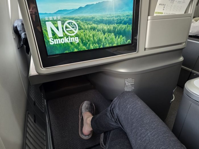 シートを倒す時間もたぶんありませんが、さっそくスリッパに履き替えて広々した足もとを堪能します。