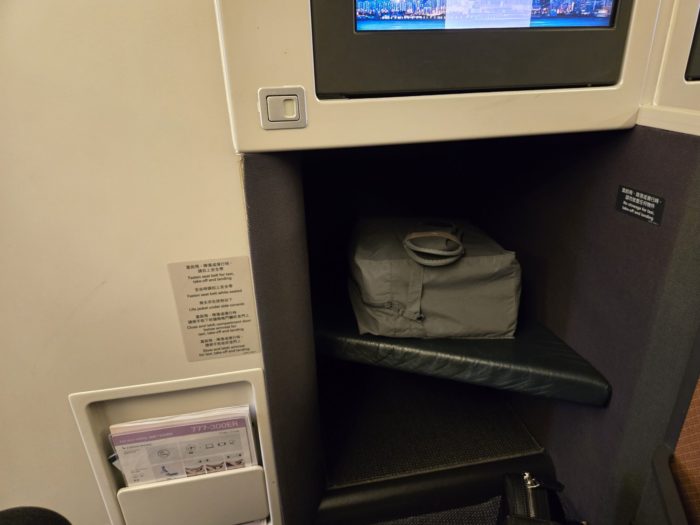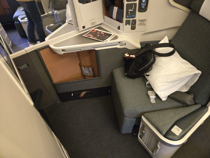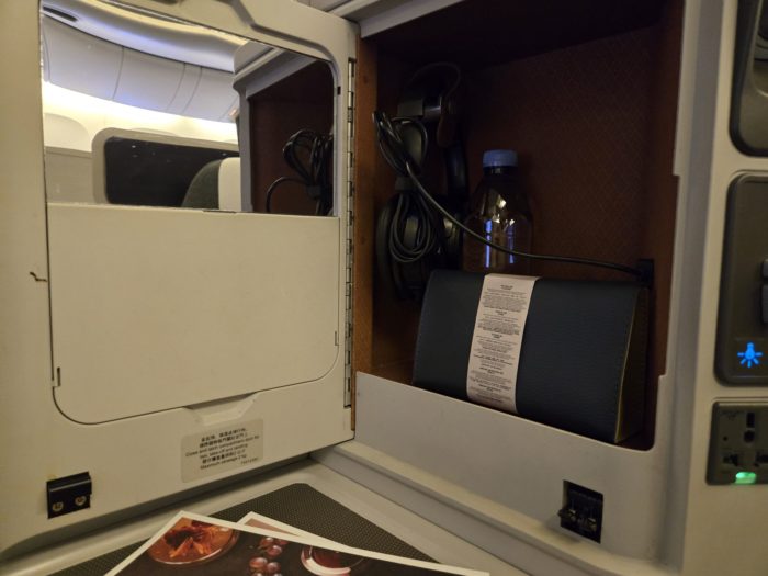 キャセイのビジネスクラスは最近アリアスイートというドア付きシートが導入されましたが、この機材は従来型のシート。