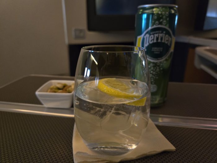 その後離陸して機内サービスがスタートしてからのドリンクはペリエに変えました。