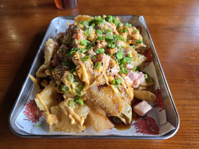 それを、揚げたワンタンチップスと一緒に食べるポキナチョス。