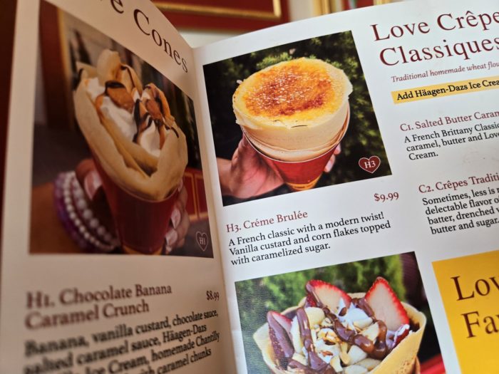 お値段は、クレームブリュレのクレープが9.99ドル、友達のシンプルなクレープが7.99ドル、ガレットが16.99ドルでした。
