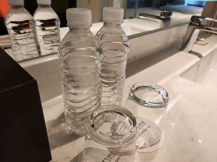 コンプの水は2本。バスルームに置いてありました。
