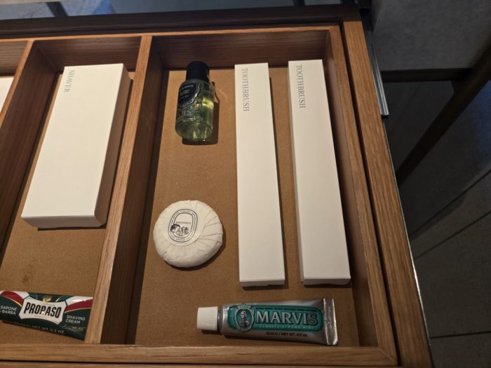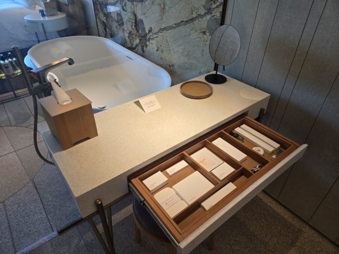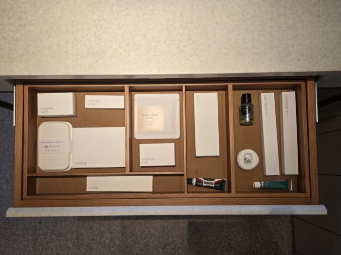 引き出しのアメニティーはスキンケアなど充実のラインナップですが、すっきりと収納されています。