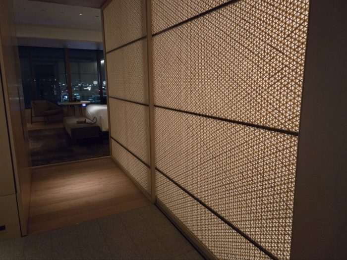 この光が透けているでっかい壁が実はスライディングドアで、裏に先ほどの洗面が隠れています。
