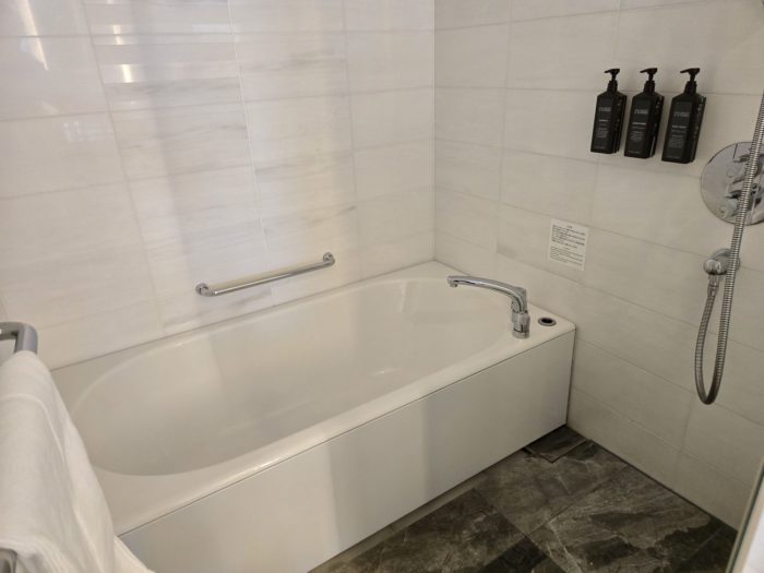 その手前にバスルームがあるのですが、ここはバスタブの外で体が洗える日本式のお風呂です。