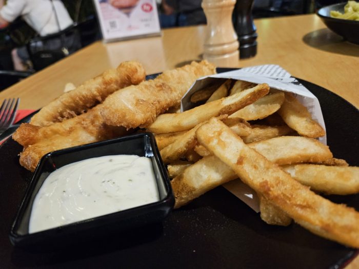 1杯だけ飲んでから、フィッシュ&チップスで飯にしませました。
