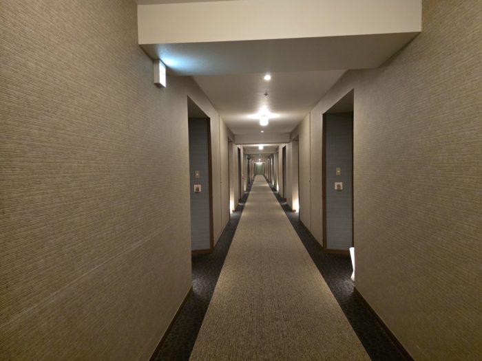 建物に入ると細長いロビーの先にフロントがあります。