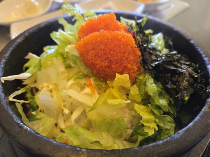 石焼ビビンバと同じ熱した石の器に入っていて、ご飯の下にはキムチが敷かれていました。