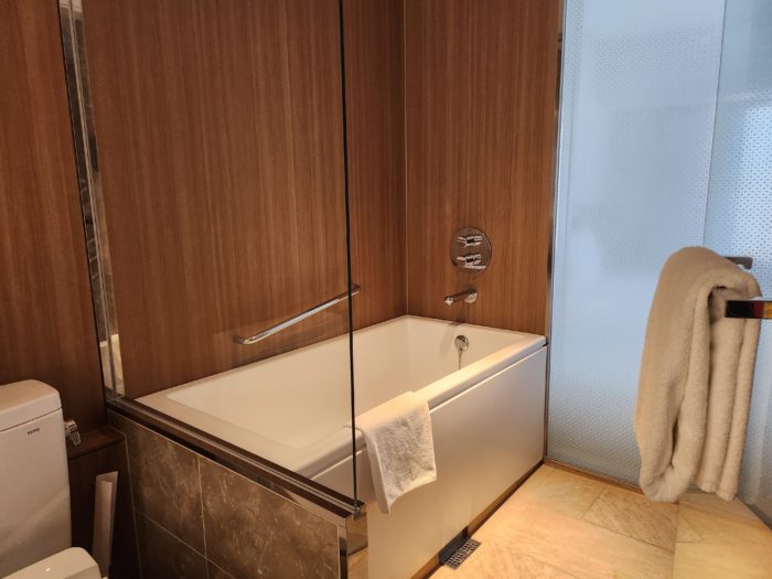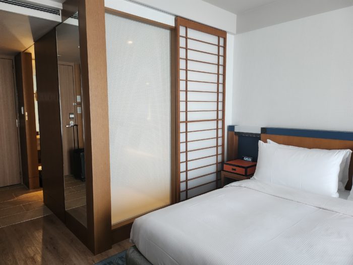 ヒルトン名古屋の客室は和テイストでヒルトン東京と似ているけど、ヒルトン東京では透け透けのバスルームとベッドルームの間のガラスはティントシールで見えないようになっていました。