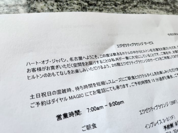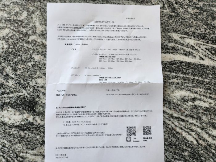 これはチェックイン時にもらったラウンジの案内。ハートオブジャパン!名古屋。
