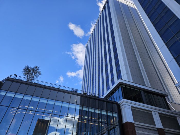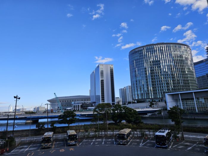 奥の白い柱が並んでいるのがアリーナ、その手前の四角いビルがヒルトンですね。