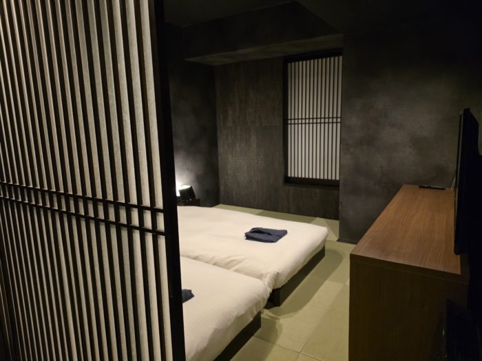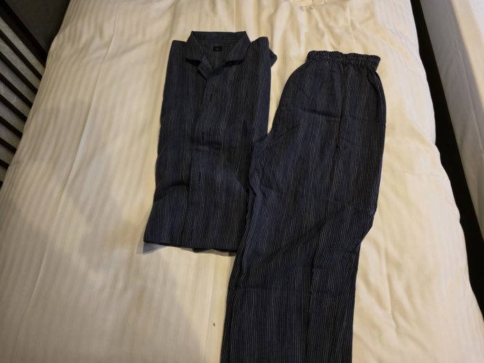 ベッドの上にあるのは上下セパレートのパジャマです。これも甚平っぽい和の生地。