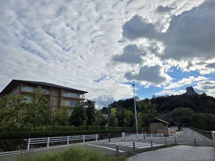 右の山の上にあるのが犬山城。左の建物が今回泊まるホテルです。