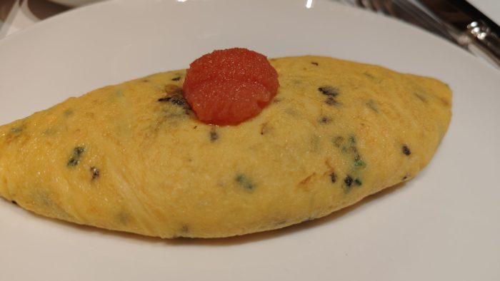 明太子の乗ったピリ辛オムレツ。