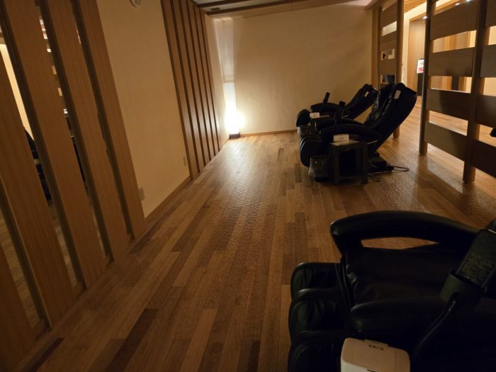 湯上がりにはゆっくりできるラウンジスペースと、マッサージチェアが置かれたスペースがありました。