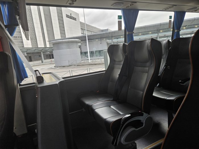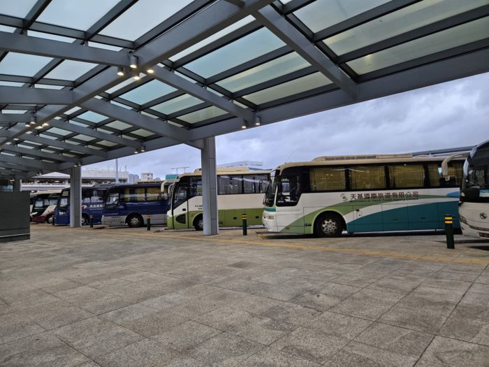入口前にバスが並んでいたから「このどれかに乗るのか?」と思ったけれど、出国審査を受けて制限エリアから乗るから違いますよね。