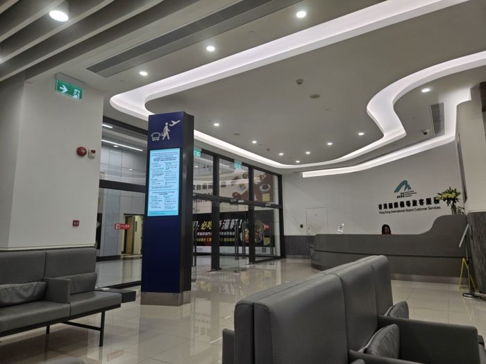 ここで香港から先のフライトのチェックインができ、荷物も預けることができます。