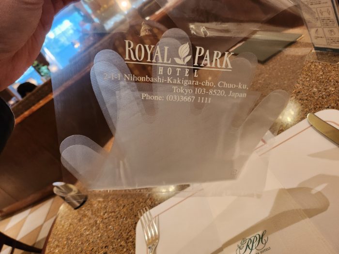 他のホテルではたいていビュッフェ台に使い捨てでたくさん置いてあるのに、1人1枚渡されるのは珍しいですね。