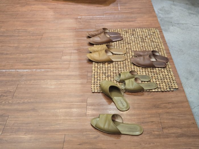 靴を脱いで入るのですが、スリッパも自社製のレザー。いいね。