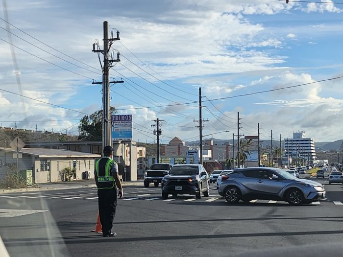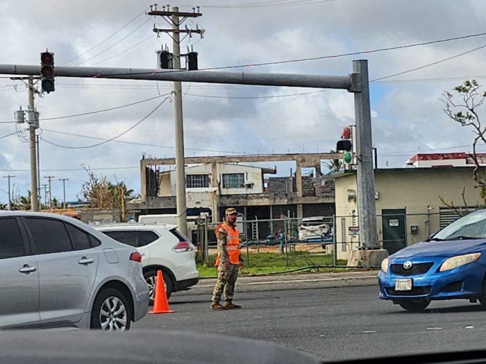道路は、停電のためか損傷のためか、恐らく両方によって信号が全く動いていないので、警察官だけではなく軍や税関などの公務員まで出て交通整理をしています。