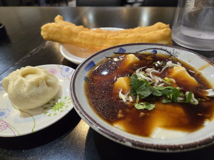 砂糖を付けたらうまいと書いている人がいましたが、俺は豆腐脳という豆腐のあんかけを頼み、そちらに浸けて食べてみました。