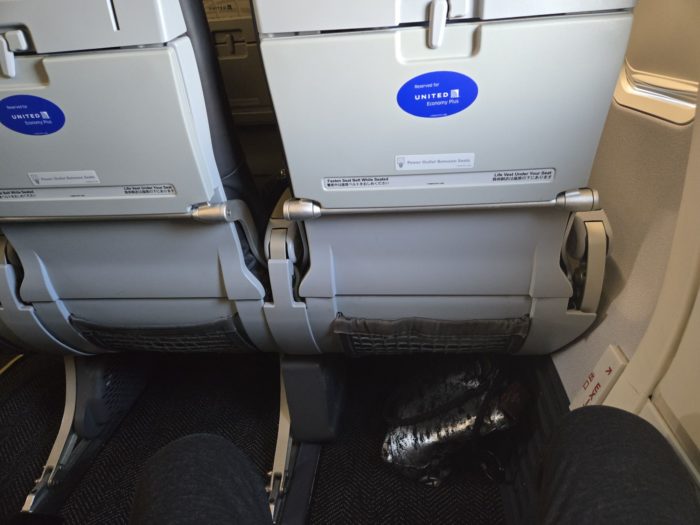 ひとに挟まれた真ん中席になったらイヤだなーと心配しましたが、フライト2時間前に指定された座席は足元の広い非常口席でした。