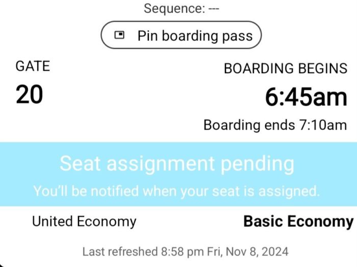 今回予約したのがベーシックエコノミーという一番安い運賃だったため、オンラインでチェックインした時点では座席指定ができませんでした。