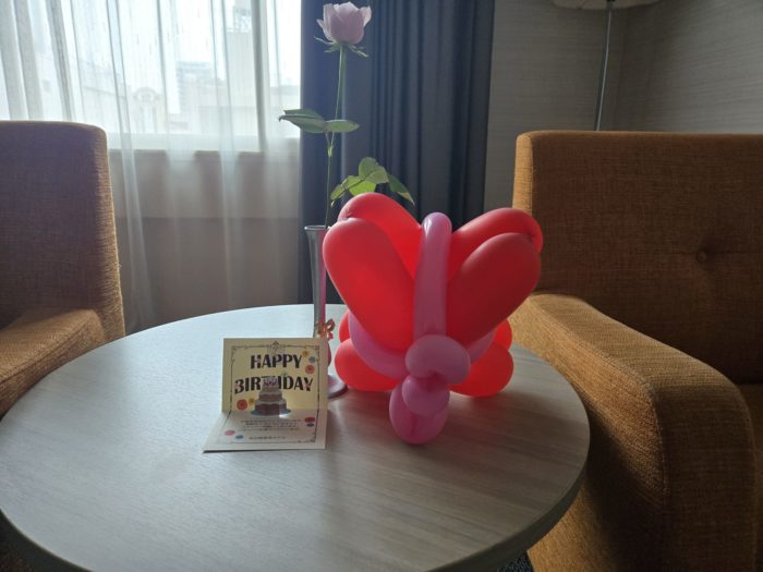 東急の会員だから誕生日月だとわかったみたいで、部屋に風船とバースデーカードが置いてありました。