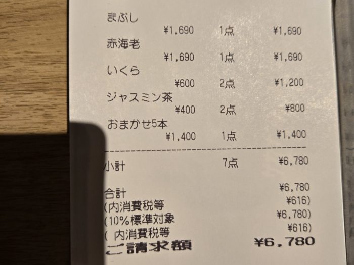 ドリンクは2人ともお酒ではなくジャスミン茶を飲み、2人で支払いは6,780円でした。
