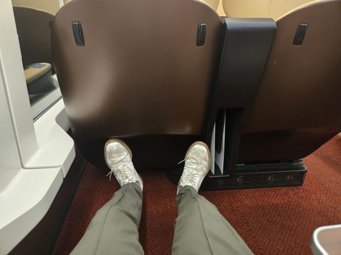 足もと広々で国内線のファーストクラス、または近距離国際線のビジネスクラス並みの快適シートです。