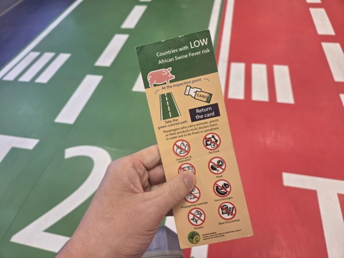 アフリカ豚熱のリスクが高い国から到着した乗客は赤、低リスク国からは緑の札を渡されるみたい。