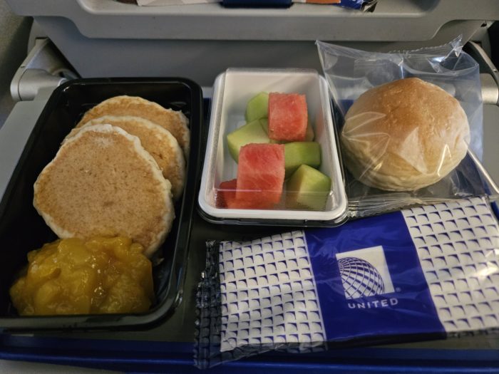 機内食ってメインが何でもパン付いてくること多いけど、パンケーキにパン、いるかなぁ。