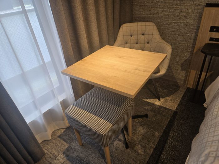 無理矢理隙間にいれた感じだけど、ないのとあるのでは利便性が大違いのテーブルセット。