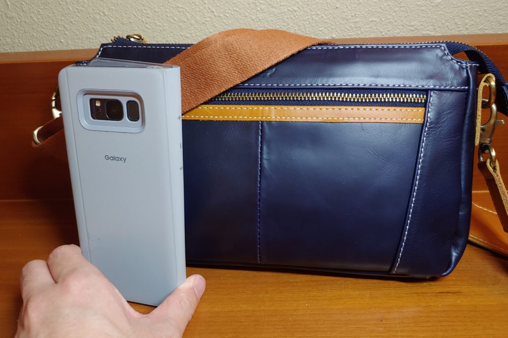 条件は、飛行機の中で手元に持ってても邪魔にならない小ささ。でも、財布、スマホ2台、モバイルバッテリー、イヤホンぐらいは入れておける適度な大きさ。