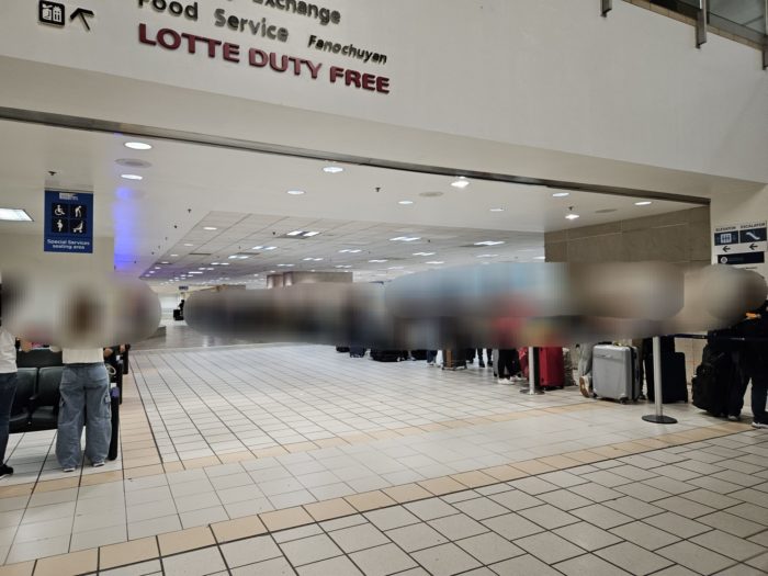 普通のカウンターとは別にこの行列の人たち専用のカウンターが設けられていたから、チャーター便かミリタリーかな?みんなアメリカ人のようでした。