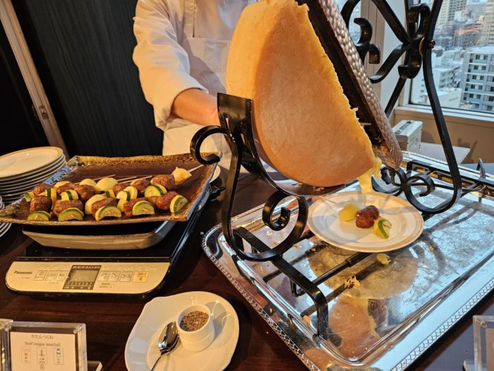 スタッフが溶けたチーズを串刺しのつくねにかけてくれます。