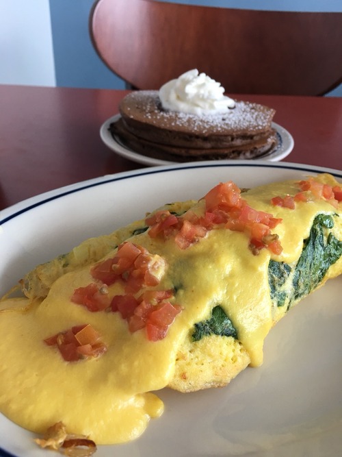 オムレツにセットでパンケーキが2枚付いてくるんだけど、そんなに食えねぇっての。