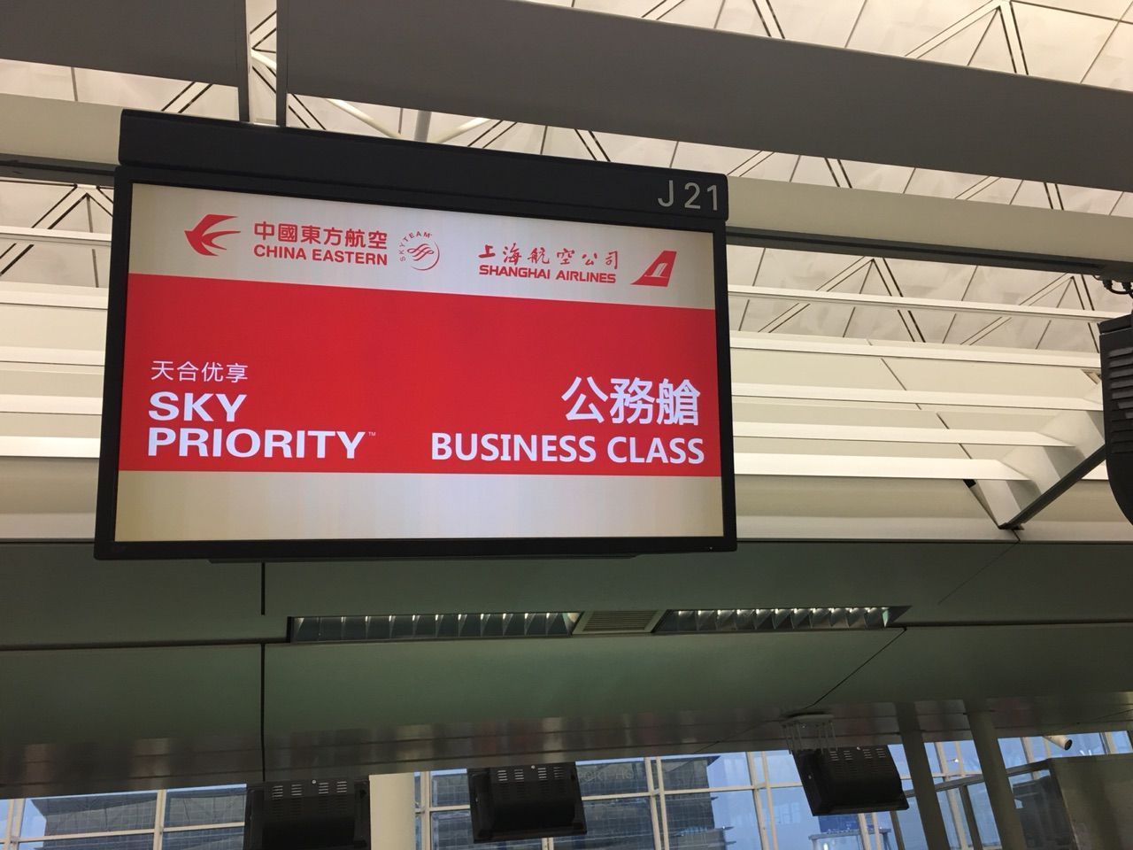 中国東方航空のチェックインカウンター、けっこー並んでたけどデルタ航空ゴールド資格のおかげでスカイチームエリートプラス会員なので、優先カウンターでチェックインします。