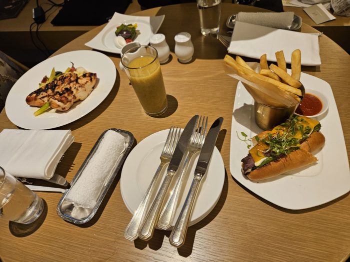 2人でどうするか相談し、到着後に遅めのランチをレストランで、そして夕食をルームサービスでとることで使うことにしました。